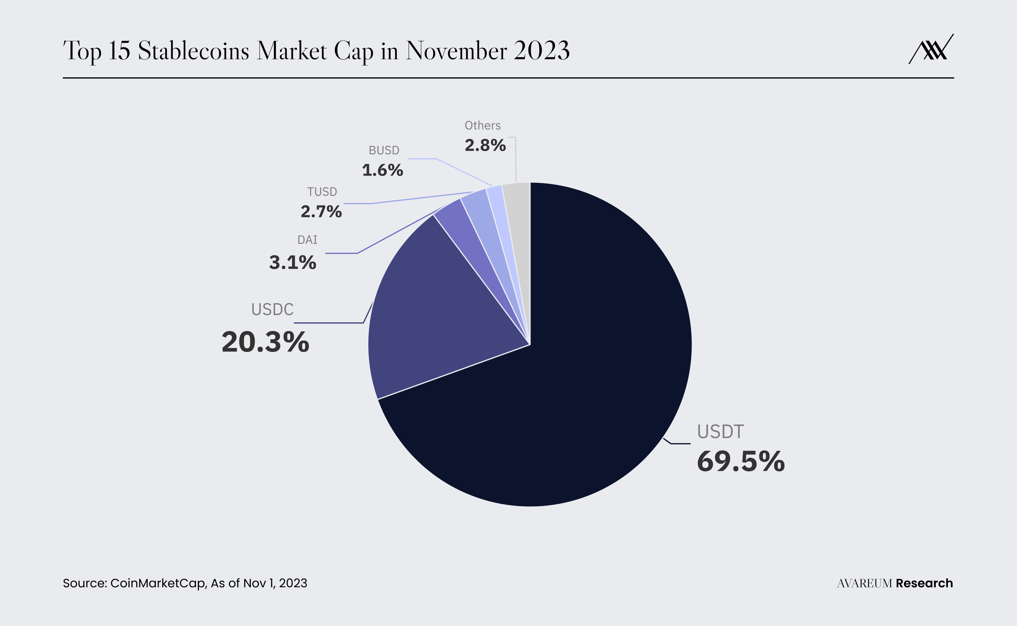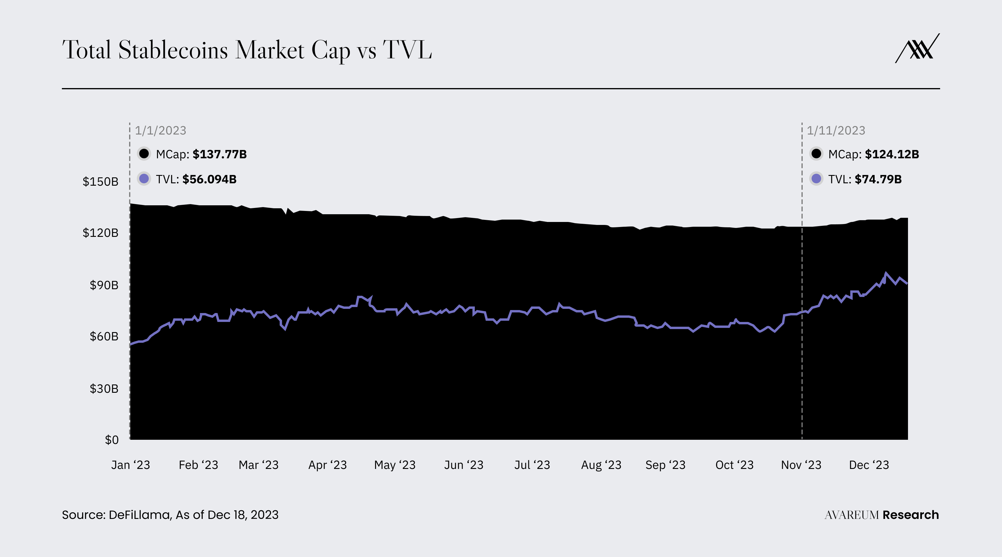 Stablecoin ถือว่าเป็นตัวกลางที่ถูกใช้ในโลกคริปโตในการใช้แลกเปลี่ยนซื้อ-ขาย เหรียญอื่น ๆ ที่มีอยู่ในตลาด โดยจากภาพรวม เราจะเห็นว่ามูลค่ารวมของ Stablecoin นั้นยังมีแนวโน้มลดลงอยู่ จากตอนต้นปีที่มีขนาดอยู่ที่ $137.77B ลดลงมาอยู่ที่ $124.12B (ลดลง -9.91%) อ้างอิงข้อมูล ณ วันที่ 1 พฤศจิกายน 2023 นั้นแปลว่า สภาพคล่องในโลกคริปโตยังไม่ได้กลับมา เงินยังไหลออกอยู่ แต่ในทางกลับกันเราจะเห็นว่ามีเงินฝากเข้ามาบน DeFi Protocol เพิ่มขึ้น ตัว Activity บนโลก DeFi เริ่มกลับมาบ้างแล้วจากเงินเก่าที่มีในระบบ โดยตอนต้นปี 2023 นั้น TVL ของ Stablecoin มีมูลค่าอยู่ที่ $56.09B ได้เพิ่มมาเป็น $74.51B ในวันที่ 1 พฤศจิกายน (เพิ่มขึ้น 32.84%)