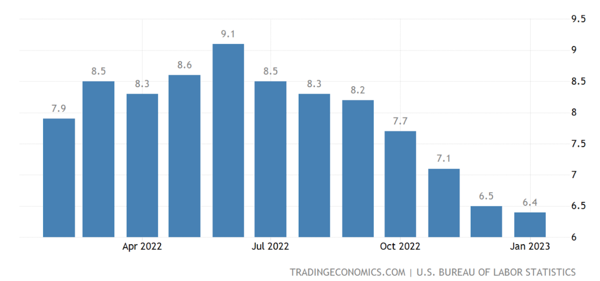 ปัจจุบันตัวเลขเงินเฟ้อสหรัฐอเมริกาอยู่ที่ 6.40% ลดลงติดต่อกันเป็นเดือนที่ 7 จากจุดสูงสุดที่ 9.06% แต่ยังคงลดลงช้ากว่าที่คาดหวังจากเป้าหมายเงินเฟ้อที่ 2% ซึ่งเป็นตามที่ทีม Avareum Research คาดการณ์ตั้งแต่ช่วงปลายปี 2022 ว่าการลดของเงินเฟ้อน่าจะเป็นแบบค่อยเป็นค่อยไป ซึ่งแม้จะเป็นผลดี แต่ก็ยังจะทำให้แนวโน้มการขึ้นดอกเบี้ยของ FED จะยังคงเดินหน้าต่อไป แม้จะลดแนวโน้มความแข็งกร้าวลงก็ตาม