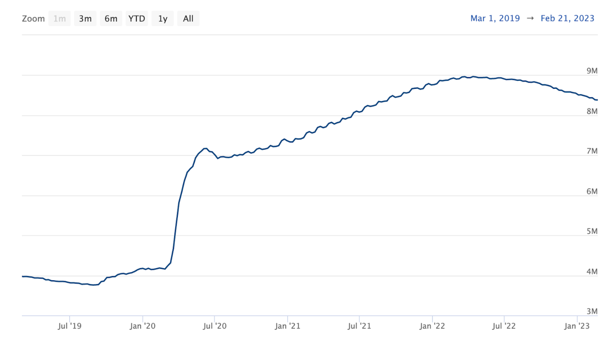 FED เริ่มทำ QE Tapering อย่างจริงจังตั้งแต่ช่วงเดือนพฤษภาคม 2022 จากงบดุลของ FED ที่ $8.965 ล้านล้าน ลดลงมาที่ $8.382 ล้านล้านในช่วงเดือนกุมภาพันธ์ 2022 หรือทำการลดงบดุลไปแล้ว $583 พันล้านในช่วง 10 เดือนที่ผ่านมาตามแผนการลดงบดุล