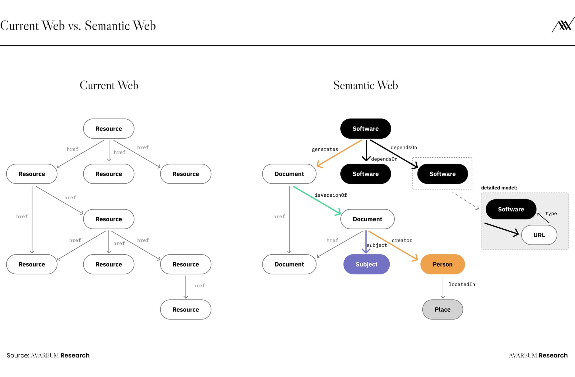 เมื่อเปรียบเทียบกันแล้ว Web2.0 ซึ่งเป็นอินเทอร์เน็ตเวอร์ชันปัจจุบัน ส่วนใหญ่เกี่ยวกับการแลกเปลี่ยนข้อมูล อนุญาตให้ผู้ใช้สร้างและแชร์เนื้อหาแบบโต้ตอบ ทำให้เกิด Social Media Blog และ e-Commerce