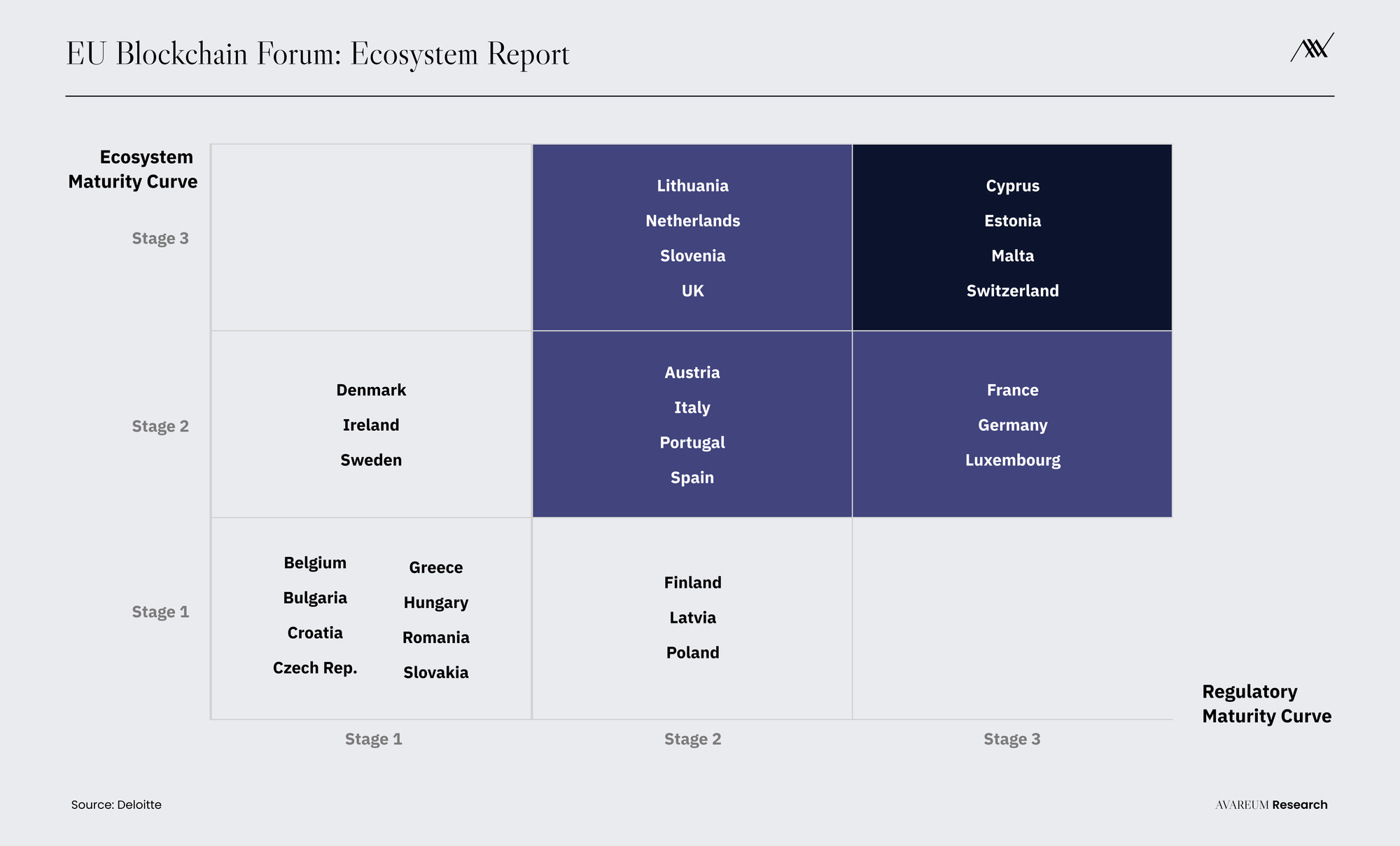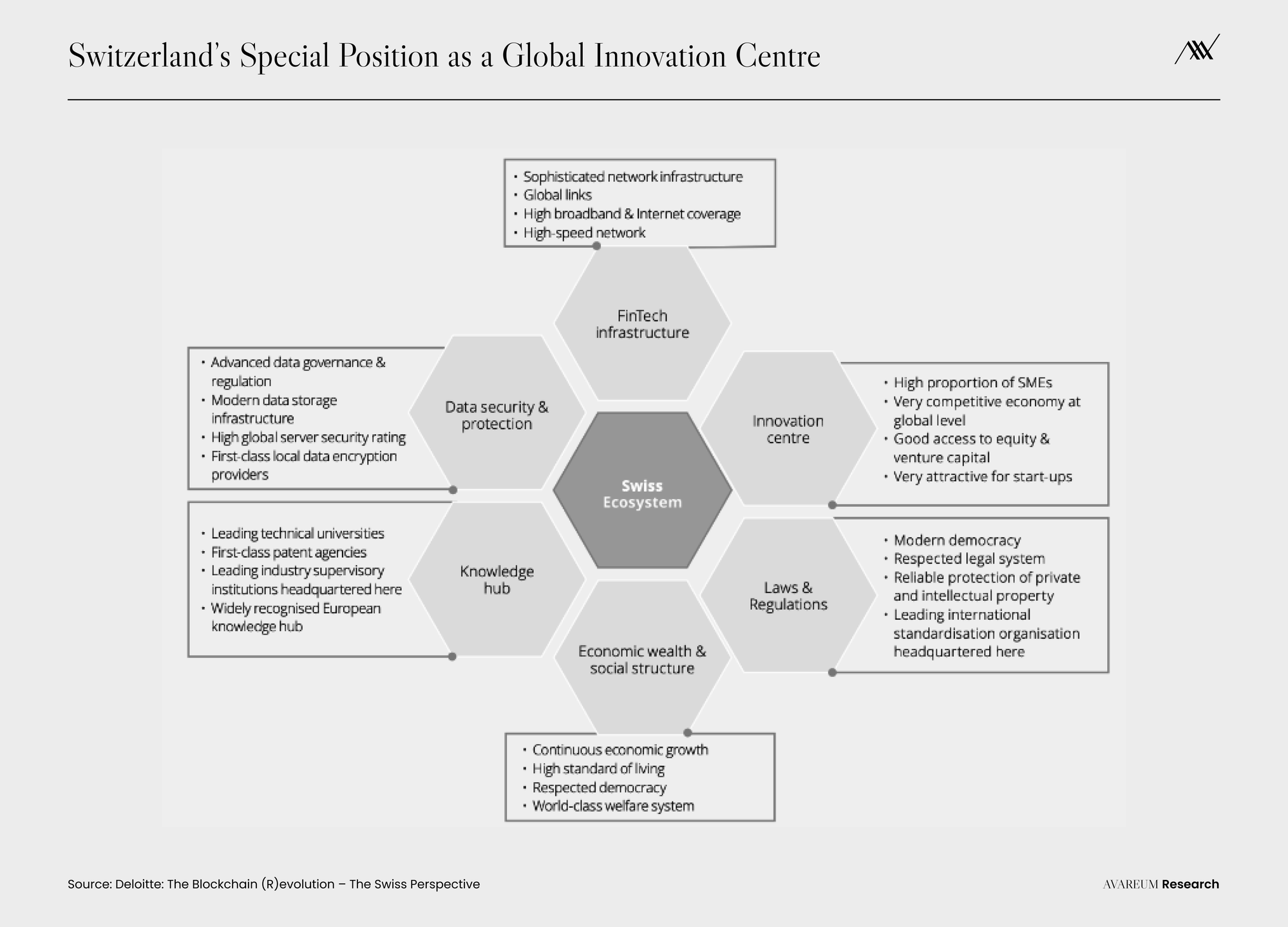 ไม่เพียงเฉพาะในยุโรปแต่รวมถึงทั่วโลกด้วย มันถูกเรียกว่า “Crypto Nation” และเป็นที่ตั้งของโปรเจคที่มีชื่อเสียงระดับโลก อย่าง “Crypto Valley” ของ Zug เป็นที่ตั้งของบริษัท Blockchain จำนวนมาก ที่เป็นที่รู้จักมากที่สุด เช่น Ethereum Foundation, Polkadot, Cardano, Solana, Cosmos และ Tezos บริษัทและองค์กรที่ดำเนินงานทั่วประเทศระดมทุนได้มากกว่าประเทศอื่น ๆ ในขณะที่การประเมินมูลค่ารวมของบริษัทชั้นนำ 50 แห่งนั้นสูงมาก นอกจากนี้สวิตเซอร์แลนด์ยังเป็นที่ตั้งของธนาคาร Blockchain 2 แห่งแรกอย่าง SEBA และ Sygnum โดยได้รับใบอนุญาตการตั้งธนาคารจากหน่วยงานกำกับดูแลตลาดการเงินของสวิตเซอร์แลนด์สถานการณ์ทางกฎหมายของสินทรัพย์ดิจิทัลอย่างคริปโต ได้มีการรายงานฉบับแรกสุดของรัฐบาลกลางที่เผยแพร่ในปี 2018 การวิเคราะห์การบังคับใช้กรอบกฎหมายที่มีต่อบริษัท Blockchain ก็ถูกประกาศ ในปี 2020 โดยรัฐสภาสวิตเซอร์แลนด์ผ่านกฎหมายครอบคลุมเทคโนโลยี DLT และปรับใช้กฎหมายของรัฐบาลกลางที่มีอยู่ 10 ฉบับ ในเดือนสิงหาคม 2020 หนึ่งในการเปลี่ยนแปลงที่สำคัญจากผลบังคับใช้ดังกล่าวคือ ใบอนุญาตสำหรับภาคธุรกิจ หลายมหาวิทยาลัยได้เปิดตัววุฒิการศึกษาที่เน้นเรื่องของ Blockchain หรือหลักสูตรเฉพาะทาง