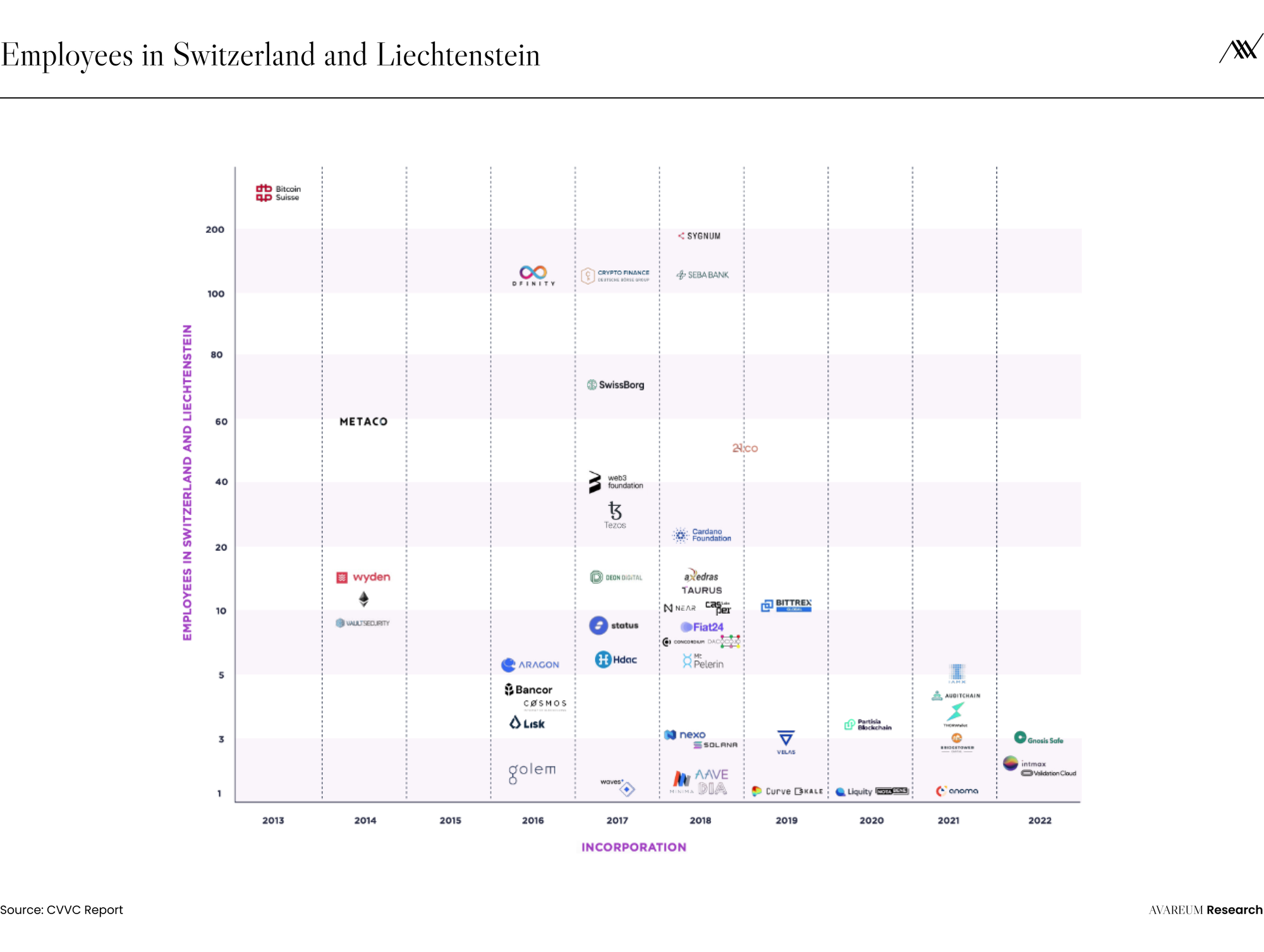 หากแบ่งตาม Location เราพบว่าจาก 1,135 บริษัทนั้น 510 บริษัทจดทะเบียนที่ Zug และ 197 บริษัทอยู่ที่ Zurich และข้อมูลการจ้างงานใน Crypto Valley ณ ปี 2022 พบว่า มีอัตราจ้างงาน 5,766 ตำแหน่ง จาก 1,135 บริษัท Bitcoin Suisse มีจำนวนพนักงานมากที่สุด คือ 308 ตำแหน่ง ในขณะที่ บริษัทอื่น ๆ จะมีพนักงาน ทำงาน Online จากหลายประเทศ