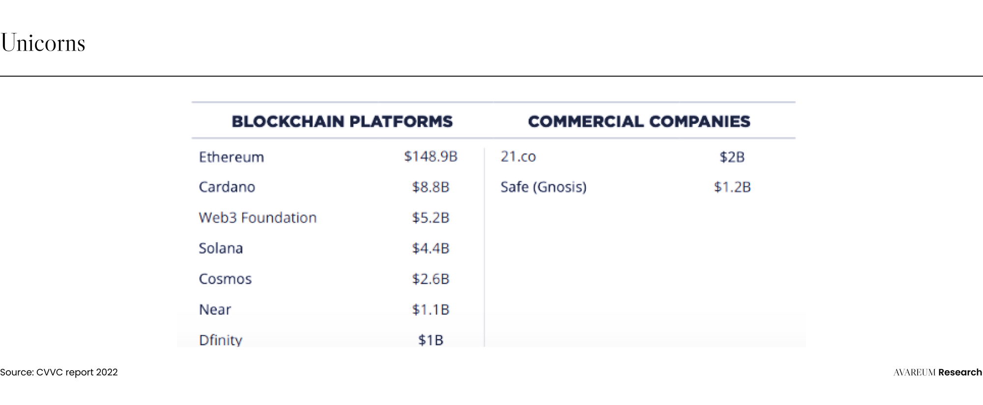ใน Crypto Valley มีบริษัทที่เป็นระดับ Unicorn ถึง 9 บริษัทด้วยกัน โดยที่บริษัทเหล่านี้ถูกประเมินว่ามีมูลค่ามากกว่า $1B ซึ่งประกอบไปด้วยบริษัทเอกชนจำนวน 2 บริษัทและบริษัทที่เกี่ยวข้องกับการทำ Blockchain Platform 7 บริษัท ตามตารางด้านบน