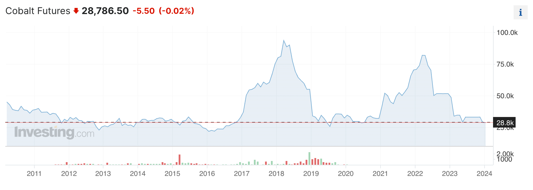 ตอนนี้ราคา Cobalt Futures ที่ตลาด LME ตกต่ำมาอยู่แถวๆ 28.8k ต่อสัญญา จากที่เคยไปเกือบถึง 100k ต่อสัญญาในช่วงปี 2018 และขึ้นไปถึง 80k ต่อสัญญาในช่วงโควิดที่เกิด supply shortage เรียกได้ว่าตอนนี้ Cobalt ถือว่าราคาถูกทีเดียว